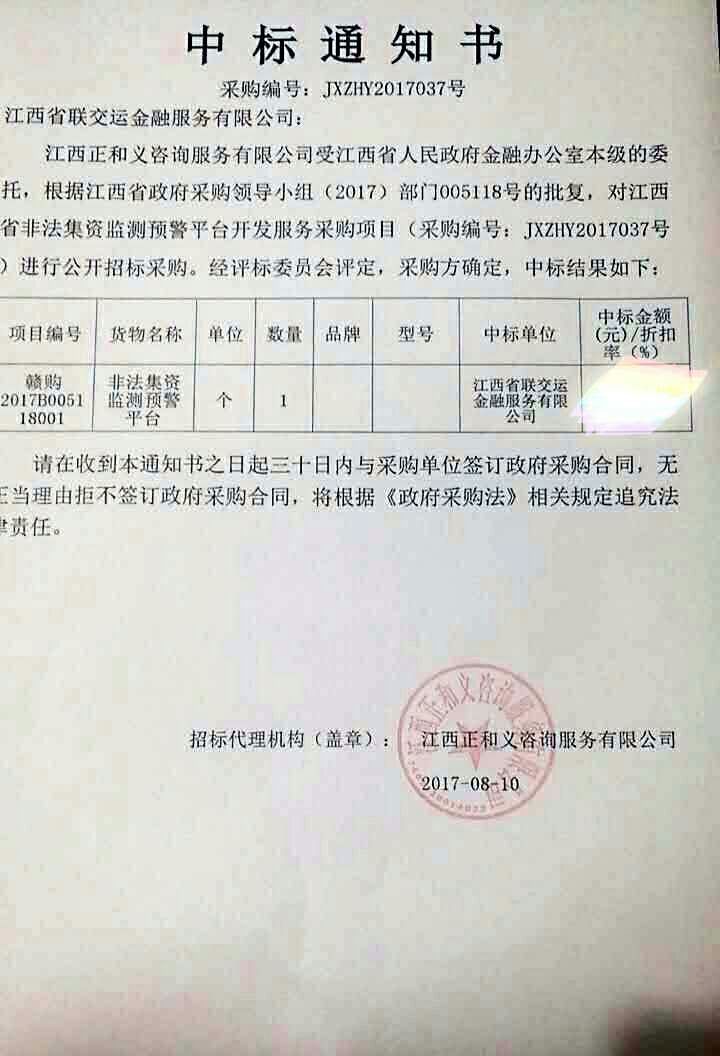 2017年8月9日,江西省聯(lián)交運金融服務(wù)有限公司(以下簡稱“公司”)成功中標(biāo)江西省非法集資監(jiān)測預(yù)警平臺開發(fā)服務(wù)項目,這標(biāo)志著公司在向江西省地方金融統(tǒng)一監(jiān)管云平臺的建設(shè)目標(biāo)上又邁出了堅實一步。