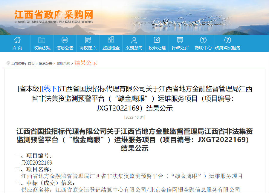 繼連續(xù)兩年中標江西省非法集資監(jiān)測預(yù)警平臺(“贛金鷹眼”)運維服務(wù)項目后,近日,江西聯(lián)交運又中標江西省非法集資監(jiān)測預(yù)警平臺(“贛金鷹眼”)輿情監(jiān)測服務(wù)項目。